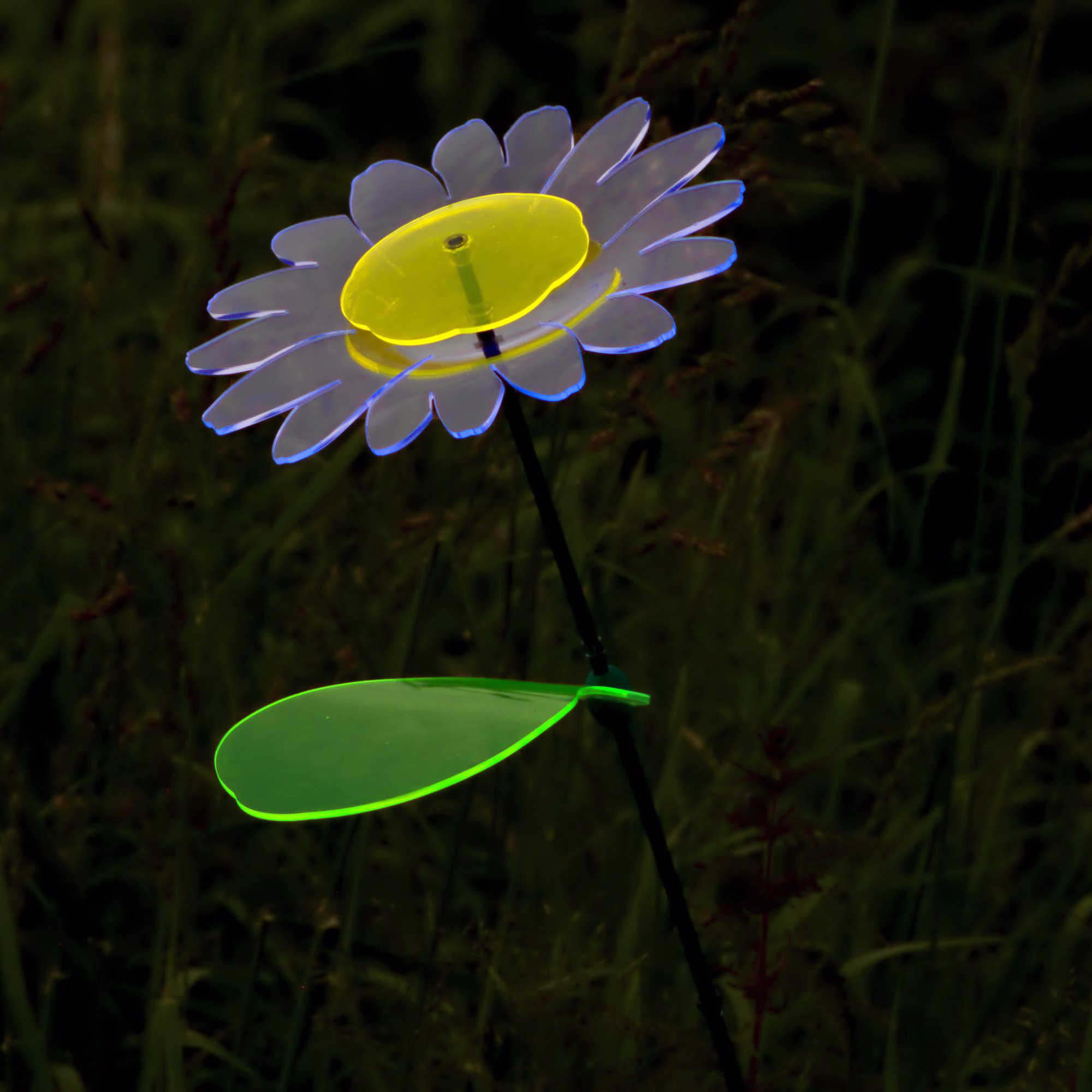 Sonnenfänger, Gartendeko, Gartenstecker, Blume: Kristall-Violett, das leuchtende Gänseblümchen im Gras, groß Mit der Verwendung des kristall-violetten Materials für die Blütenblätter weichen wir zwar etwas vom Original ab – es bleibt aber doch unverkennbar ein Gänseblümchen. Und in dieser Farbe kannst Du es auch unter Millionen anderen leicht finden. Nee – ist nur Spaß! Was es tatsächlich von allen anderen unterscheidet ist sein vielfarbiges Leuchten und seine unglaubliche Größe. Ja natürlich – „Größe“ ist nicht alles. Mit seinem frei drehbaren Blatt hat dieses Gänseblümchen aber auch in technischer Hinsicht eine ganze Menge zu bieten. Und dieses Blatt hat noch eine weitere erstaunliche Eigenschaft. Bei leichtem Wind schwingt das Blümchen wie jede andere SunForm auch. Lass Dich nicht vom Namen täuschen. Weil diese „Gänseblume“ ohnehin schon so viel größer als all ihre Vorbilder ist, haben wir ihr einen etwas kürzeren Schwingstab (100 cm) gegeben. Damit ist sie zwar geringfügig niedriger als die meisten anderen Outdoor-SunForms, aber bei weitem noch groß genug – und sie braucht ja auch nicht unbedingt so riesig wie die Sonnenblume sein. Wenn Du willst, kannst Du aber natürlich auch den längeren Schwingstab (140 cm) wählen. In seiner ursprünglichen Version hatte dieses Blümchen unter den Blütenblättern sogar noch einen grünen Blütenkelch. Da sich der gelbe Blütenkorb jedoch sehr deutlich in den Blütenblättern spiegelt und der Kelch zusätzlich von unten hindurch leuchtete, war die Blüte damit einfach „überbelichtet“ – und so haben wir letztlich auf den Blütenkelch verzichtet. Dem Blümchen hat es nicht geschadet. Im Gegenteil: Das Blau-Violett der Blütenblätter harmoniert perfekt mit dem Gelb des Blütenkorbes – und über das große grüne Blatt verfügt es ja ohnehin schon. Die realen Blätter der Gänseblümchen wachsen nicht in luftiger Höhe, sondern eher am Boden. Die Realisten unter uns werden das Blatt also in Bodennähe positionieren. In dieser Höhe kann es bei unbedachter Berührungen natürlich nicht ausweichen, und so haben wir ihm diese Möglichkeit eben auf eine andere, neuartige Weise gegeben.