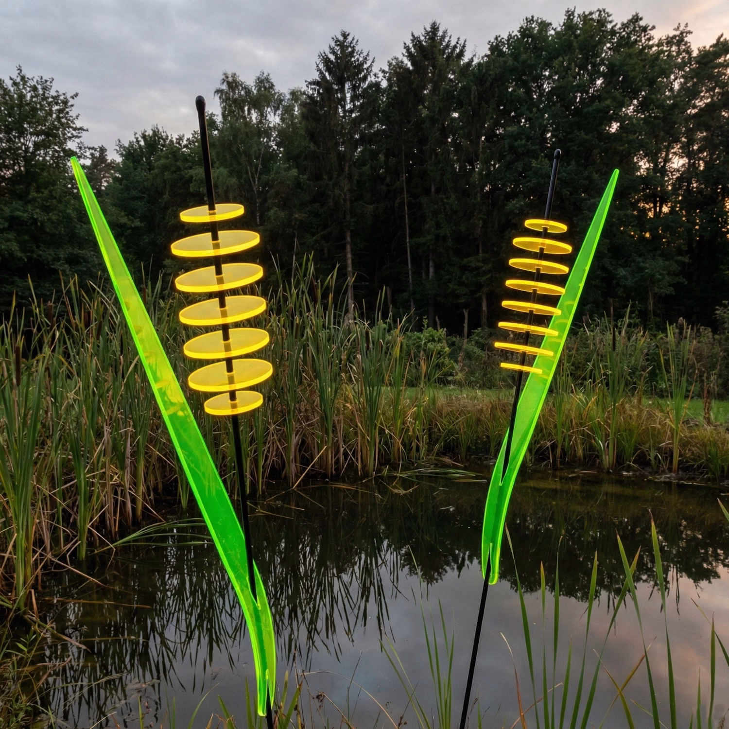 Mit diesem Sonnenfänger bieten wir Dir eine SunForm an, die mit der hochgewachsenen Eleganz ihres Originals sehr gut mithalten kann und diese vielleicht sogar übertrifft. Im Gegensatz zu ihrem „sommergrünen“ Vorbild ist das Schilfgras jedoch „immergrün“ und verbreitet auch – und gerade im Winter einen friedlichen und dauerhaften Zauber. Für diese SunForm stand natürlich der heimische Rohrkolben Modell. „Rohrkolben“ ist jedoch eine weniger schmeichelhafte Bezeichnung für eine derart elegante SunForm. Wir haben sie letztlich also: „Schilfgras“ genannt. Auch, weil es in jeder Ecke Deutschlands eine andere Bezeichnung dafür gibt. Je nach dem, wo Du gerade wohnst, sagst Du wahrscheinlich: Lampenputzer, Pfeifenputzer, Bullerbesen, Pompesel, Bumskeule oder irgend etwas anderes dazu. Unsere Bezeichnung ist also nicht ganz richtig – aber man versteht doch im ganzen Land, was damit gemeint ist. Und: „leuchtend“ haben wir sie genannt weil – nun ja – weil sie eben leuchtet. Und das nicht nur in Deutschland, sondern überall auf der Welt. Im Juni 2024 haben wir das lange Blatt von (ursprünglich) 64 cm auf etwa 72 cm verlängert. Diese SunForm ist damit noch größer und beeindruckender geworden als sie ohnehin schon war. Allein das grüne Blatt ist nun länger als die meisten kompletten Sonnenfänger (inkl. Schwingstab) anderer Anbieter. Ursprünglich zwar „nur“ als Dekoration für den Gartenteich entworfen, macht diese SunForm auch alleinstehend im Garten, auf der Terrasse, dem Balkon, oder wo auch immer Du sie „hinpflanzen“ möchtest, eine erstaunlich eindrucksvolle Figur. Der ursprünglich braune Kolben musste leider einer anderen, verfügbaren Farbe weichen. Da wir uns jedoch nicht für nur eine Farbe entscheiden konnten, bieten wir diese SunForm in den Farben: Rot, Orange und Gelb an. All diese Farben sind Bestandteile von Braun und kommen ihm doch auch mehr oder weniger nahe.