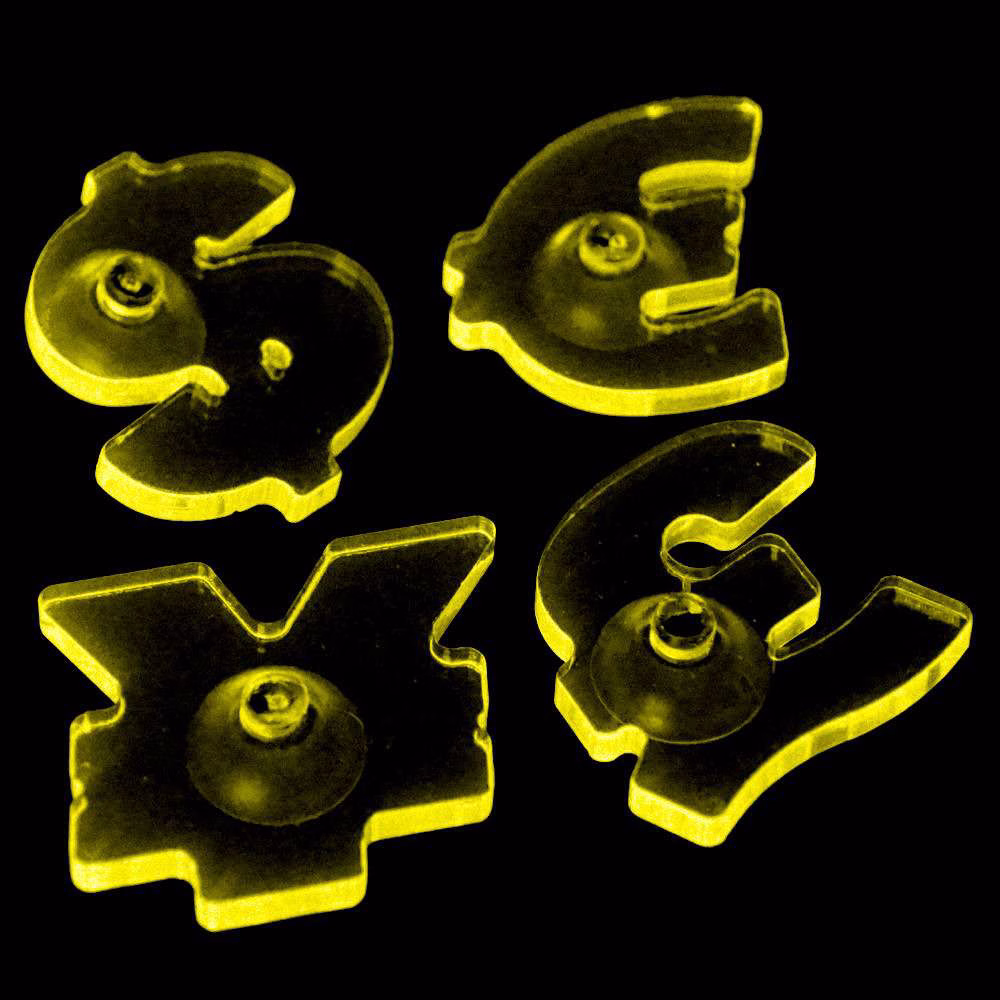 Leuchtende Währungssymbole zum anheften an Trinkgläser.